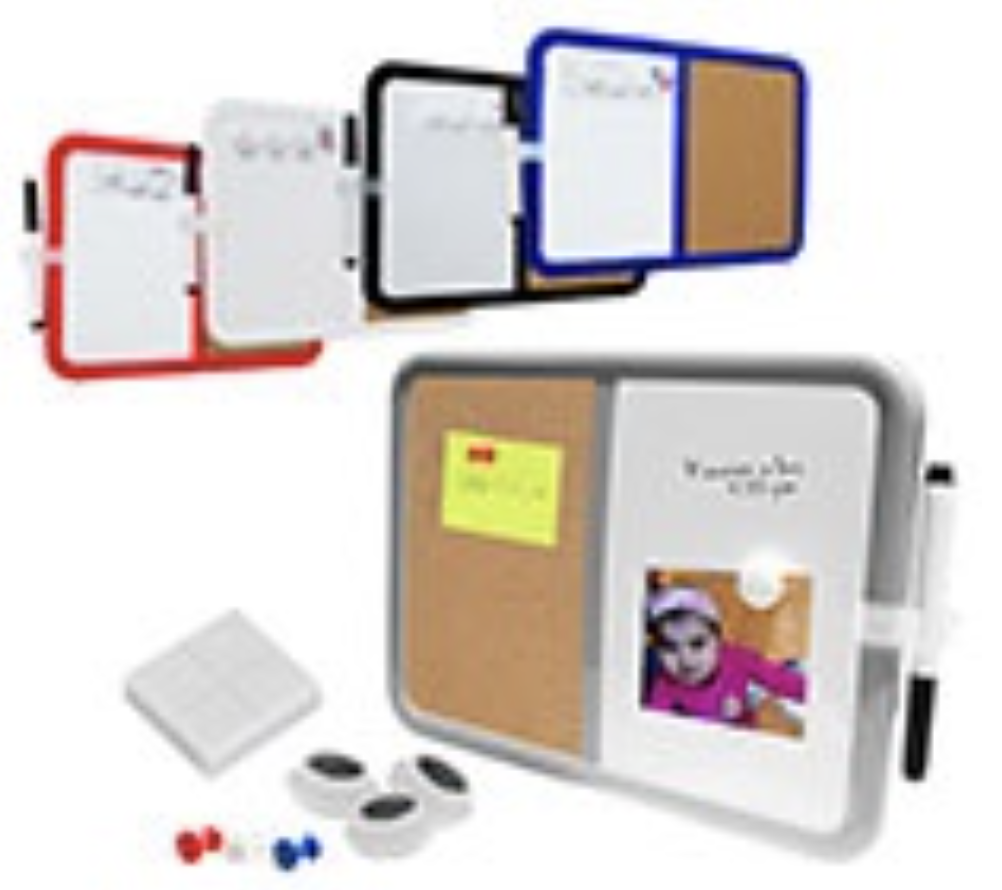 Pizarra acrílica y corcho, con imanes, incluye 1 plumón negro, 3 botones imantados, 3 chinches de colores y adhesivos doble contacto.