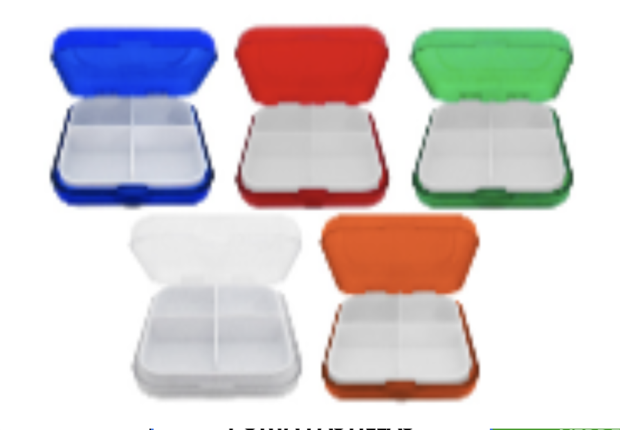 Porta pastillas de plástico forma cuadrada con 4 compartimientos.