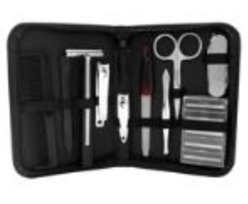 - Contiene: Peine, cortador de uñas pequeño, cortador de uñas grande, tijera para manicure, lima de uñas, pinza, navaja multifunción, afeitador, 5 repuestos de afeitador de doble filo.